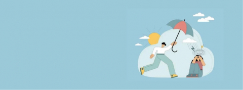 człowiek z parasolem chroni dziecko na błękitnym tle