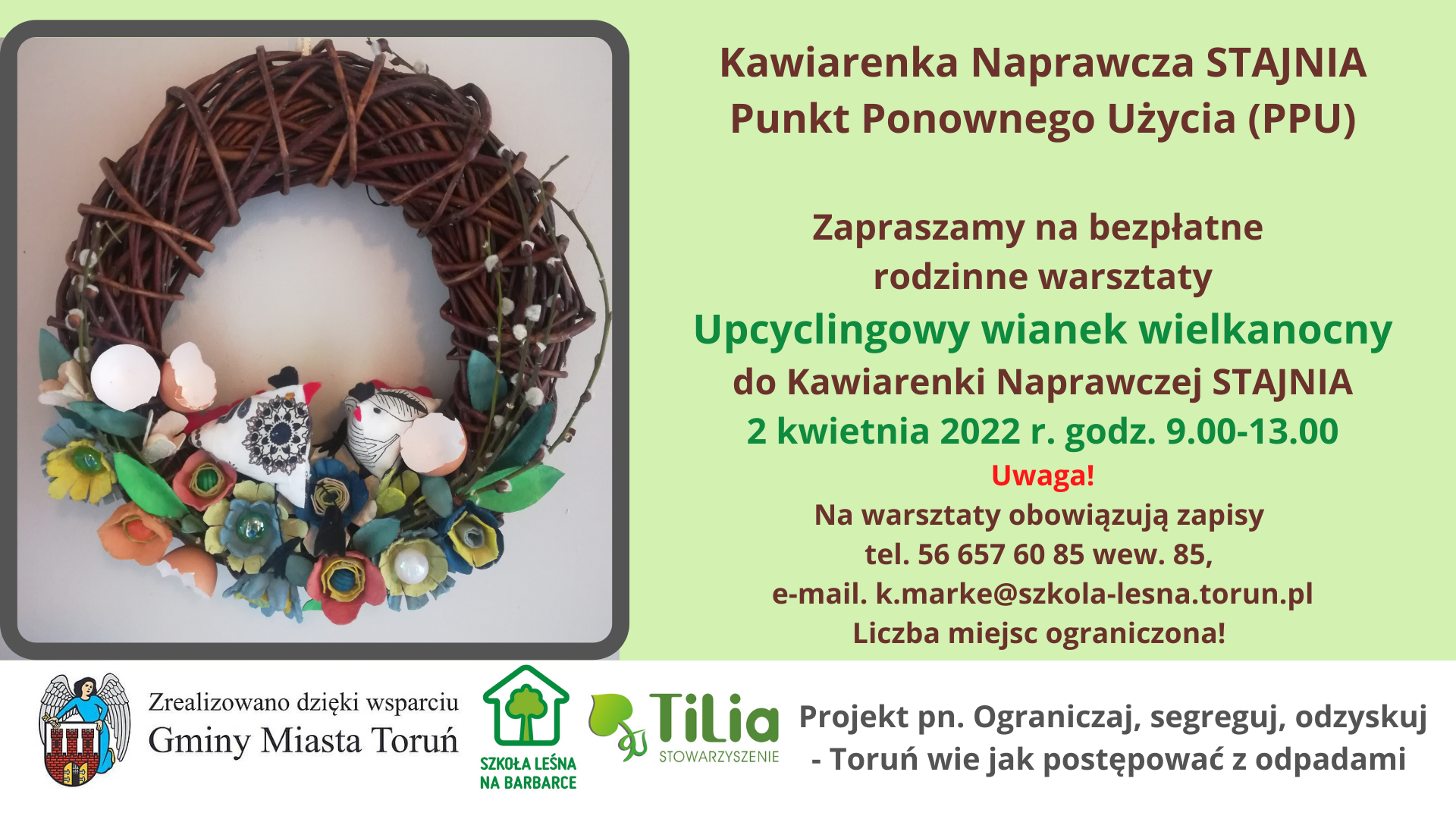 Stowarzyszenie „Tilia” rozpoczyna realizację projektu „Ograniczaj, segreguj, odzyskuj - Toruń wie jak postępować z odpadami” i wraz ze Szkołą Leśną na Barbarce zaprasza mieszkańców Torunia na pierwsze z cyklu bezpłatnych warsztatów upcyclingowych odbywających się w Kawiarence Naprawczej Stajnia.